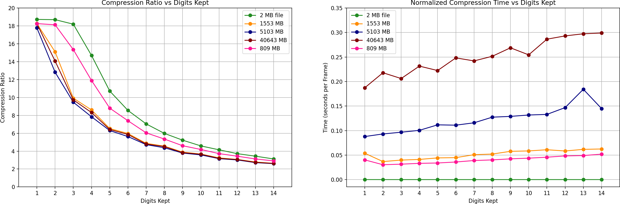 Compression Ratio vs Precision: Lower precision (fewer digits) increases compression efficiency, while higher precision preserves more numerical detail.